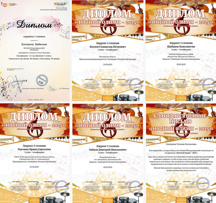 Ученики нашей школы Зайков Дмитрий, Козлов Станислав, Ранчина Ирина, Шабанов Константин и Шабанова Екатерина стали Лауреатами Международной Олимпиады по сольфеджио «Нотный Олимп-2025» и Олимпиады по музыкально-теоретическим дисциплинам «BlitzOlimp» Российской Лиги творческих инициатив «Вперёд к успеху». Поздравляем ребят и их преподавателя Синицыну Татьяну Евгеньевну!