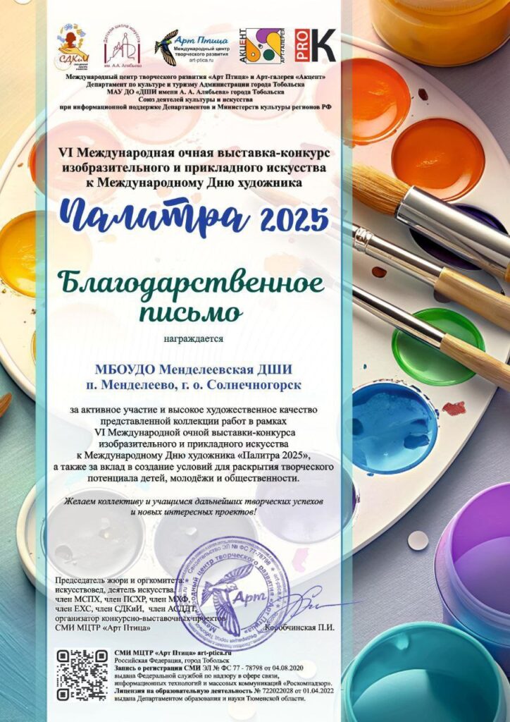 Ученики художественного отделения нашей школы Сахарова Вера, Юсупова Елизавета, Шалару Арина, Груздева Вера и Гусев Лев стали Лауреатами VI Международной очной выставки-конкурса изобразительного и прикладного искусства к Международному Дню художника «Палитра-2025».