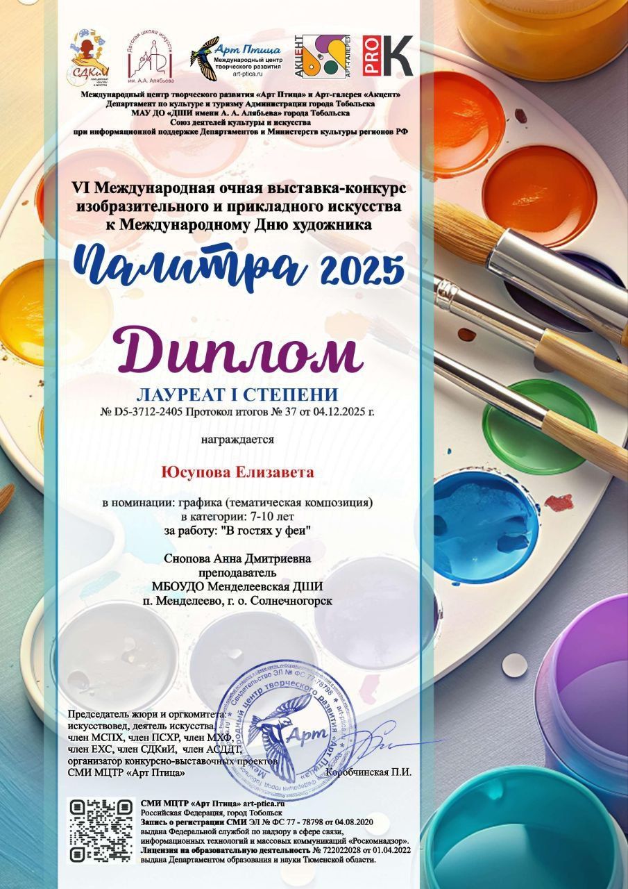 Ученики художественного отделения нашей школы Сахарова Вера, Юсупова Елизавета, Шалару Арина, Груздева Вера и Гусев Лев стали Лауреатами VI Международной очной выставки-конкурса изобразительного и прикладного искусства к Международному Дню художника «Палитра-2025».