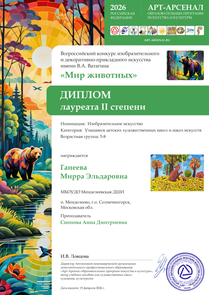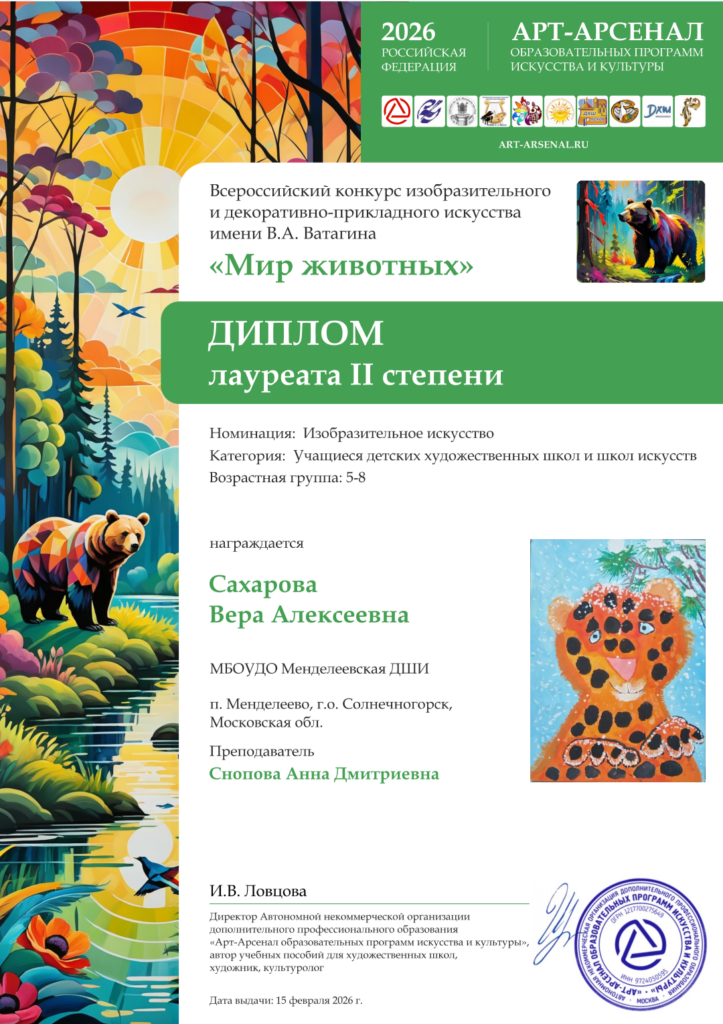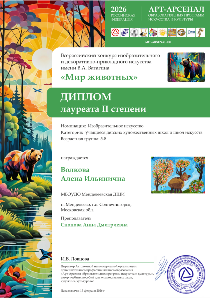 Ученицы художественного отделения нашей школы Волкова Алена, Ганеева Мирра и Сахарова Вера стали лауреатами Всероссийского конкурса изобразительного и декоративно-прикладного искусства имени В. А. Ватагина «Мир животных». Поздравляем девочек и их преподавателя Снопову Анну Дмитриевну.