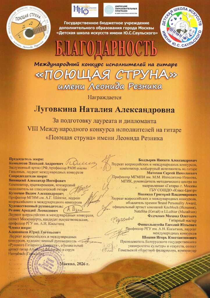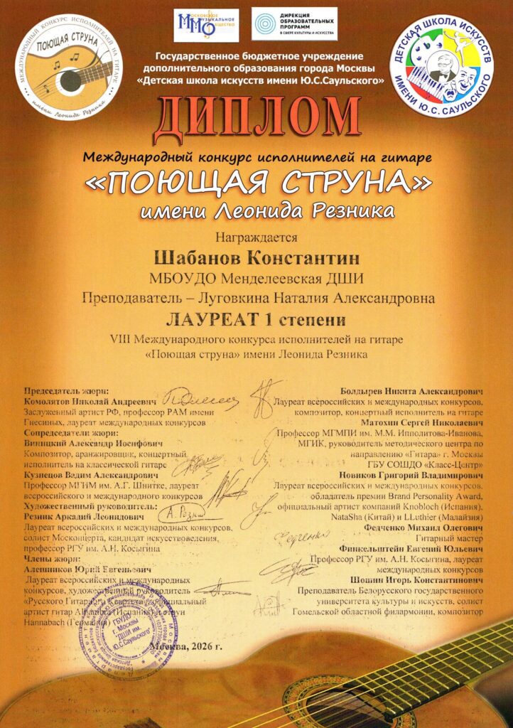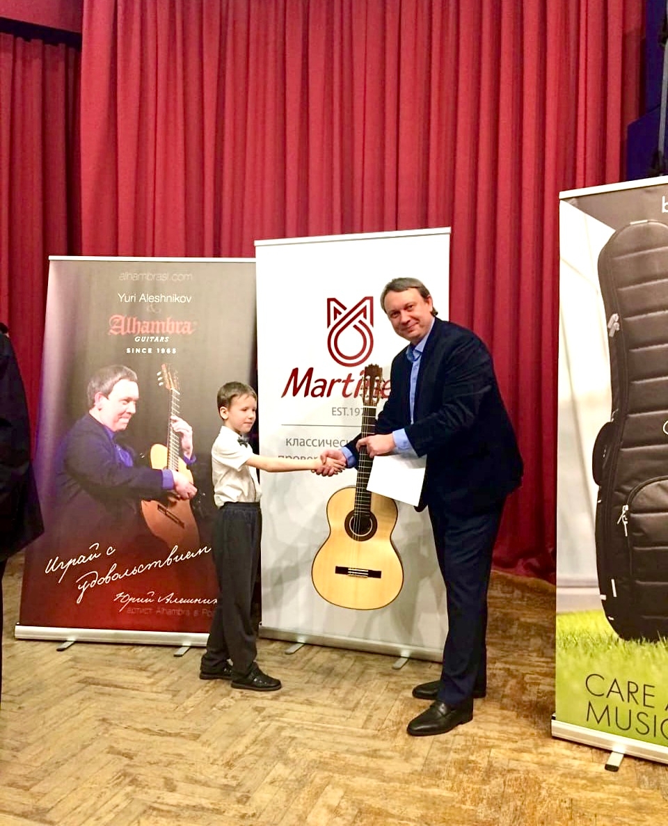 Ученик нашей школы Шабанов Константин стал лауреатом I степени престижного Международного конкурса исполнителей на гитаре «Поющая струна» имени Леонида Резника и завоевал главный приз – классическую полноразмерную гитару фирмы Martinez! Поздравляем Константина и его преподавателя Луговкину Наталию Александровну.