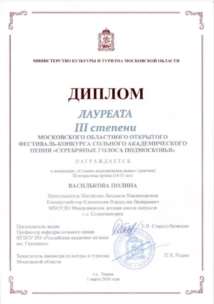 Ученики нашей школы по классу вокала Библенко Георгий и Василькова Полина стали лауреатами Московского областного открытого фестиваля-конкурса сольного академического пения «Серебряные голоса Подмосковья» в г. Химки. Поздравляем ребят, их преподавателей Габдулгалееву Татьяну Николаевну и Неклесову Людмилу Владимировну, концертмейстера Клементьева Владислава Валерьевича. Владислав Валерьевич признан лучшим концертмейстером конкурса, поздравляем!