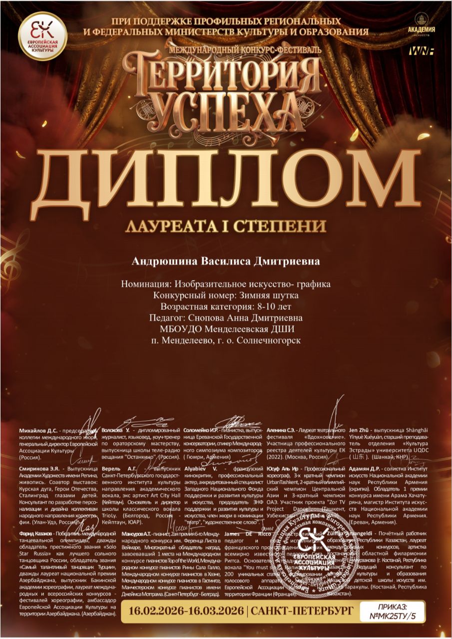 Ученики художественного отделения нашей школы Алексина София, Андрюшина Василиса, Волкова Алена, Ганеева Мирра, Гусев Лев, Карасева Эмилия, Князева Мария, Шалару Арина и Юсупова Елизавета стали лауреатами Международного конкурса-фестиваля «Территория успеха». Поздравляем ребят и их преподавателя Снопову Анну Дмитриевну.