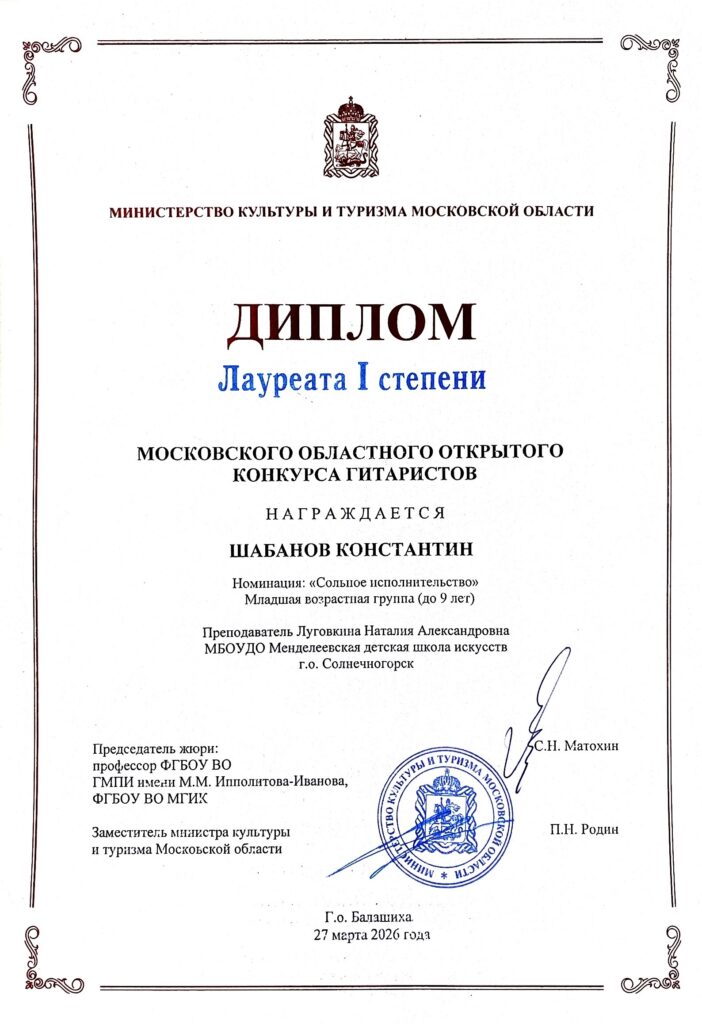 Ученик нашей школы Шабанов Константин стал Лауреатом I степени Московского областного открытого конкурса гитаристов в г. Балашиха. Поздравляем Константина и его преподавателя Луговкину Наталию Александровну